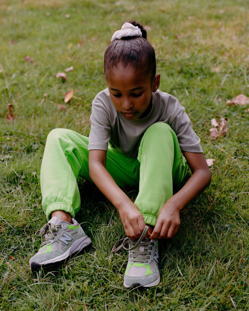 Patta created a capsule collection to complement the footwear. The collection offers a crewneck sweatshirt, sweatpants and t-shirt for adults and sweatpants and a t-shirt for kids. The apparel comes in the same bold green as featured on the Patta x New Balance 990 V3.